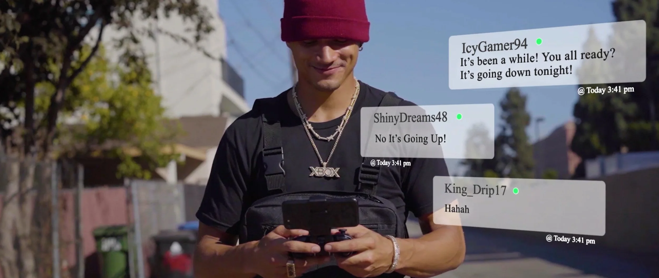 Follow four friends in their own worlds—art, dance, travel—using Xbox Remote Play and messages to link up, then converge on a rooftop session. Jewelry stays on-body, integrated through wardrobe.